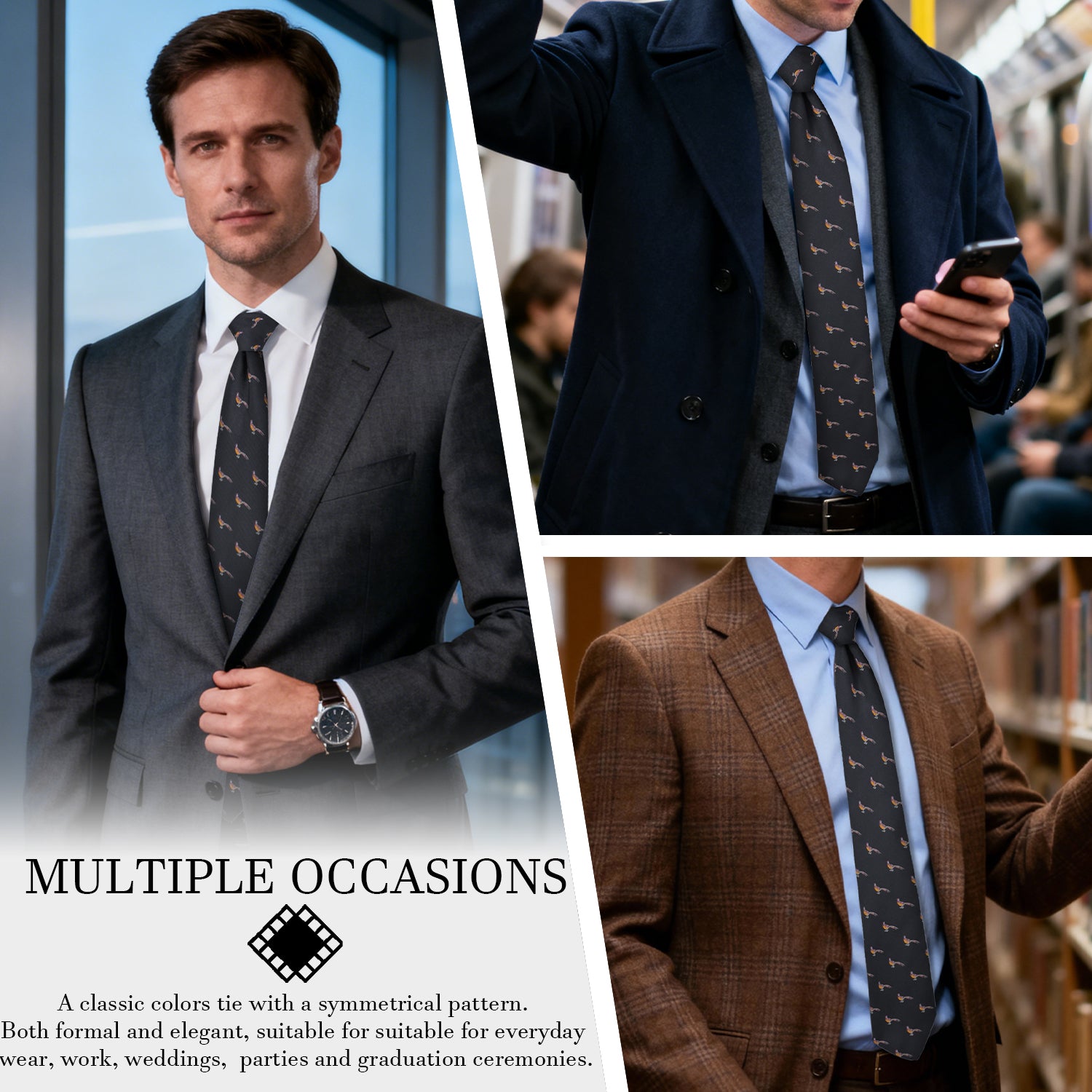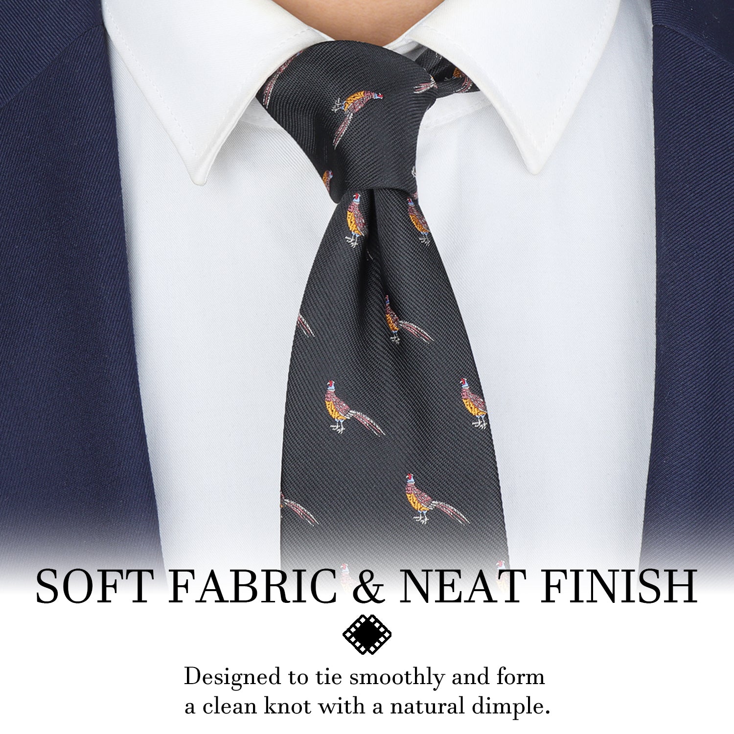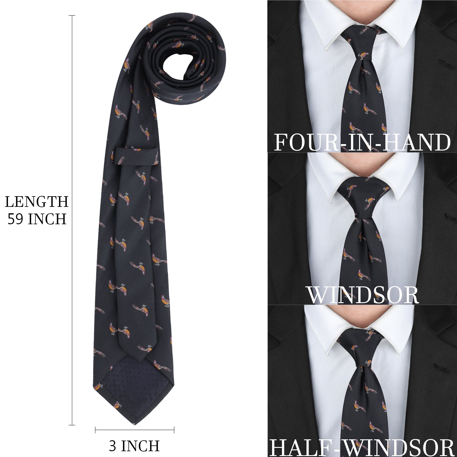 Fun pheasant print: Black background with vibrant pheasant pattern, incorporating playfulness into formal style, breaking the traditional dull tie, suitable for creative business and casual formal wear High quality fabric technology: 1200 needle ultra-fine fiber jacquard weaving, clear and three-dimensional patterns, soft and smooth texture, balancing durability and delicacy Standard size adaptation: 59 inches long, 3 inches wide, suitable for most men's body shapes, compatible with mainstream styles such as four handed knots and Windsor knots Suitable for multiple occasions: Supports different tie knot styles, covering scenarios such as business meetings and daily gatherings, with flexible style switching Personalized gift attributes: Combining decoration and fun, it is a unique choice for men's daily wear and holiday gifts