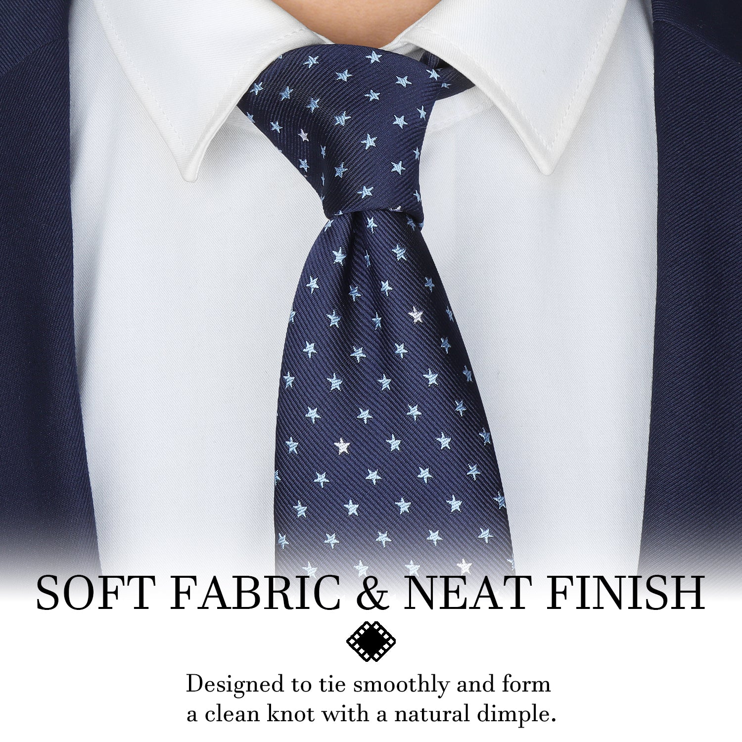 Product features Design: navy blue base color+light blue/white pentagram pattern, simple style with personalized decoration Craftsmanship: 1200 needle microfiber jacquard weaving, with clear and delicate patterns, wrinkle resistant and durable material Specification: 59 inches in length and 3 inches in width, compatible with mainstream knot styles such as four handed knot, Windsor knot, and half Windsor knot